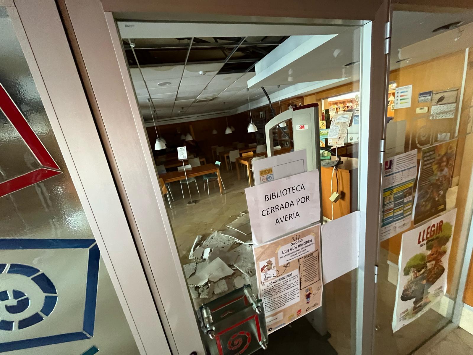 Una fuga de agua que se ha producido en el piso inmediatamente superior ha provocado que parte del falso techo de escayola de la sala de lectura infantil de la Biblioteca Central de Benidorm se haya caído obligando al cierre de esa instalación.