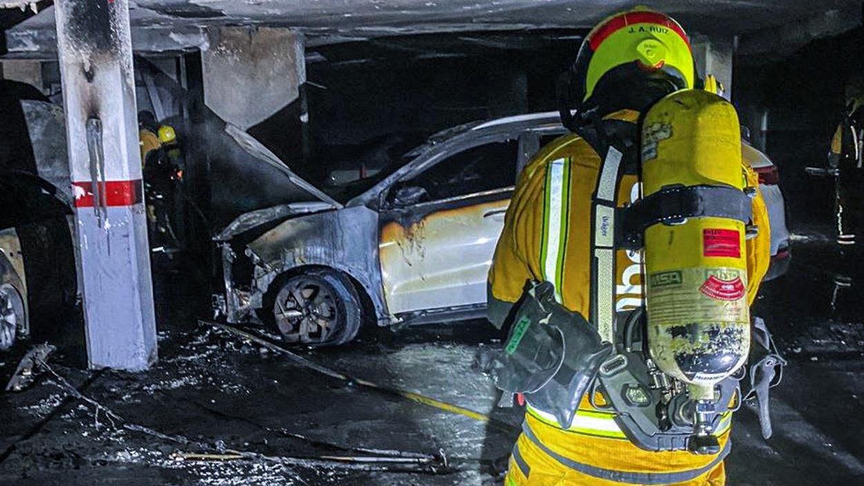 Efectivos de bomberos han sofocado un incendio en el garaje de unos edificios en Benidorm, que ha calcinado un total de cuatro vehículos y ha inundado de humo y gases tóxicos varias plantas subterráneas del inmueble.