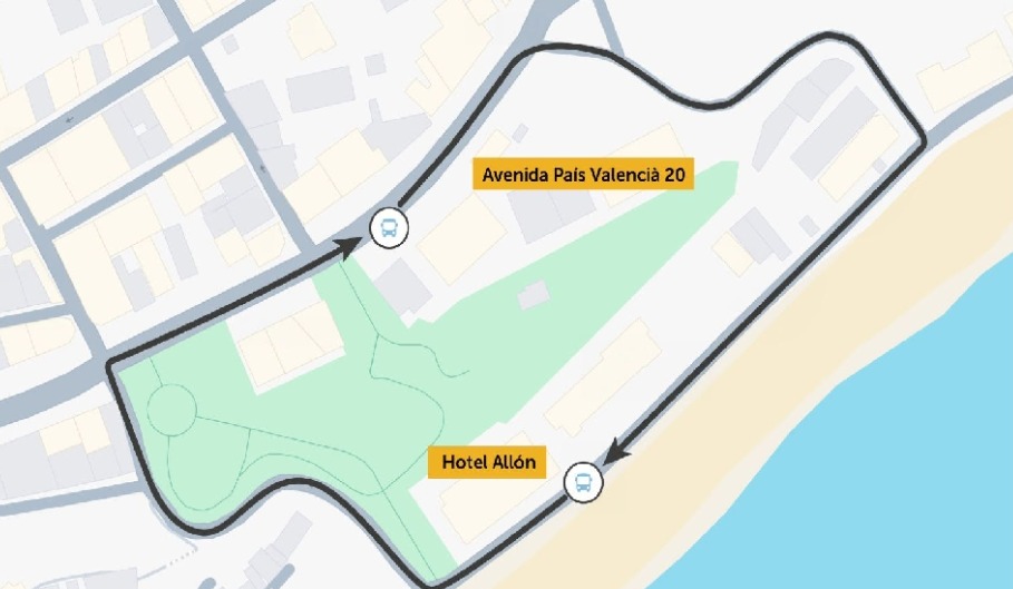El trayecto circular partirá desde la avenida del País Valencià, bajará por la avenida Varadero y continuará por la avenida del Puerto, en dirección a Alicante, para subir por la calle Censal hasta llegar de nuevo a País Valencià.