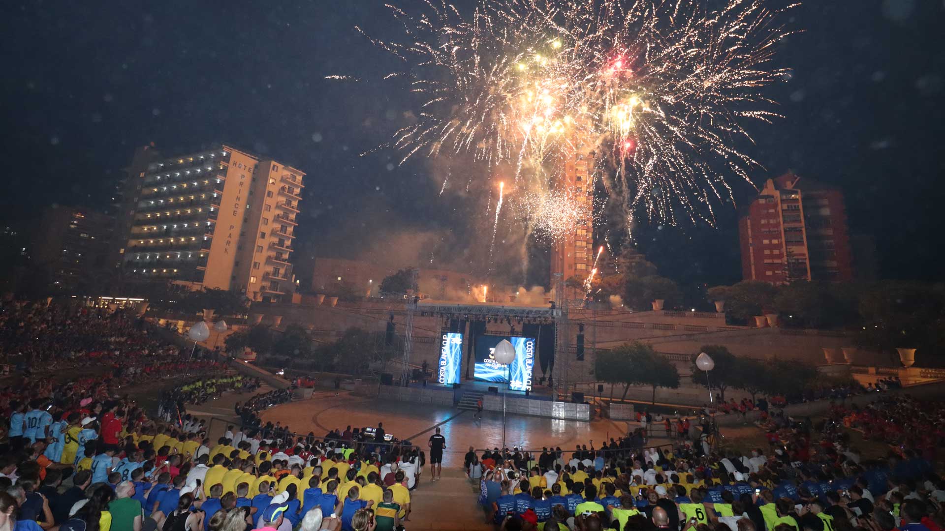 La música, los fuegos artificiales y sobre todo el entusiasmo y el buen ambiente fueron los protagonistas anoche de la ceremonia inaugural de la 30ª edición de la Costa Blanca Cup de fútbol, que contará esta año con 200 equipos procedentes de 22 países y de 12 de las 17 comunidades autónomas españolas. El desfile se inició en la calle Bilbao y culminó en el auditorio Julio Iglesias del Parque de l’Aigüera con más de 5.000 personas en su interior.