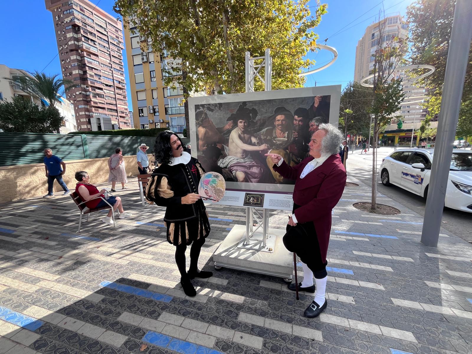 Francisco de Goya y Diego Velázquez discutiendo en una de las principales arterias de Benidorm frente a una réplica de «El triunfo de Baco», obra del segundo. Es una de las estampas que ha dejado la inauguración este viernes en la capital turística de la exposición «El Prado en las calles».