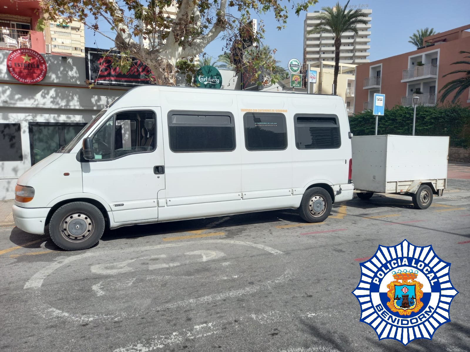 La Policía Local de Benidorm ha vuelto a inmovilizar otro transporte ilegal plagado de deficiencias. En el marco de la campaña que el cuerpo está realizando desde hace semanas los agentes han inmovilizado en esta ocasión una furgoneta sin cinturones de seguridad, con un ambientador en lugar del obligado extintor o con graves deficiencias en los neumáticos.