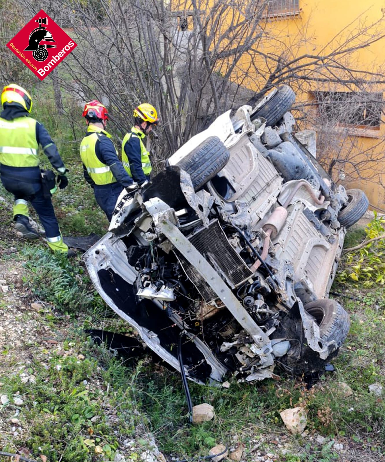 Espectacular accidente de tráfico el de este miércoles en Beniardà, una pequeña localidad en el interior de la Marina Baixa. Según han informado fuentes del Consorcio Provincial de Bomberos de Alicante, fue sobre las tres de la tarde cuando un turismo se precipitó por una ladera de más de 50 metros de altura en las inmediaciones de un mirador con vistas al Embalse de Guadalest.