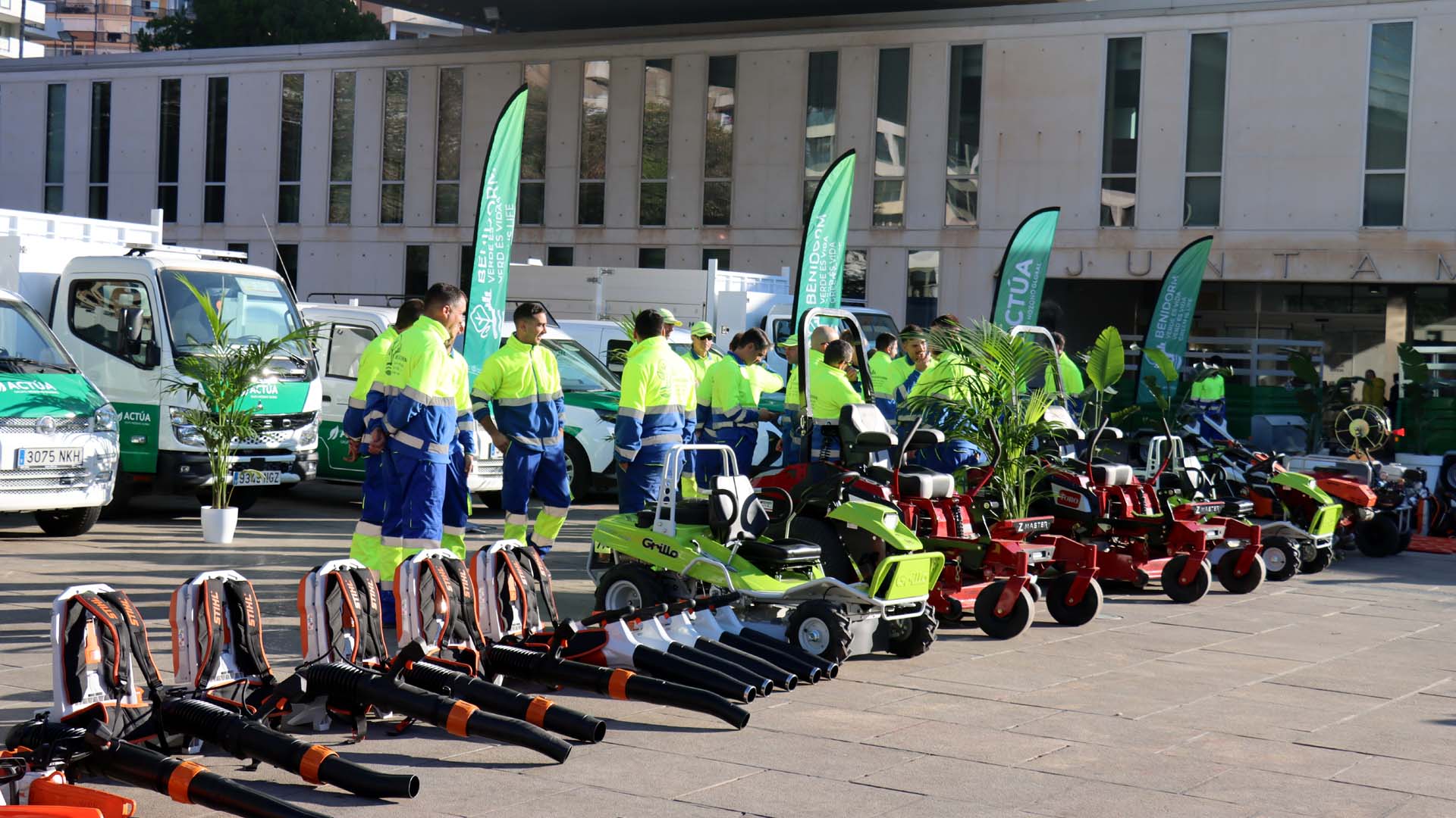 El Ayuntamiento de Benidorm ha presentado este jueves nuevo servicio de conservación, mantenimiento y limpieza de zonas verdes gestionado por Actúa. El servicio, que ya se encuentra plenamente operativo, supone «un paso adelante en la consolidación de una infraestructura verde más eficiente, resiliente y adaptada a los retos climáticos del futuro».